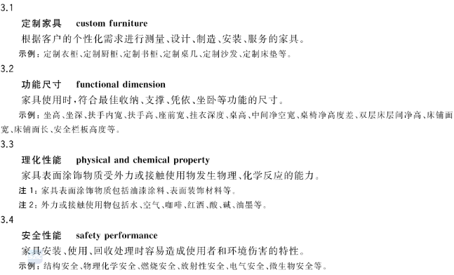 在術(shù)語和定義中首次明確了“定制家具”、“功能尺寸”、“理化性能”、“安全性能”的定義,解決了定制家具市場中定制概念術(shù)語不統(tǒng)一的問題。