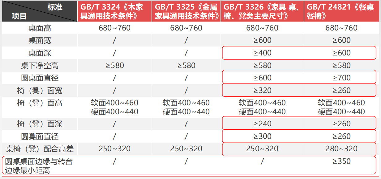 通過對GB/T 3324《木家具通用技術條件》、GB/T 3325《金屬家具通用技術條件》、GB/T 3326《家具 桌、椅、凳類主要尺寸》、GB/T 24821《餐桌餐椅》進行標準比對,發現餐桌餐椅的尺寸與普通桌椅類家具在桌面高、桌面寬、桌下凈空高、椅(凳)面高度四個項目上沒有區別,在桌面深、圓桌面直徑、椅凳面寬、椅凳面深、圓凳面直徑、桌椅凳配合高差以及圓桌桌面邊緣與轉臺邊緣最小距離七個項目上有所區別,具體見下表。