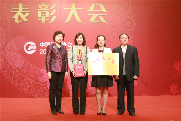 第十一屆全國政協(xié)提案委員會副主任、中國輕工業(yè)聯(lián)合會會長步正發(fā)和中華全國婦女聯(lián)合會婦女發(fā)展部部長崔衛(wèi)燕為“全國巾幗文明崗”浙江金華錦繡國際家居(右)頒獎。