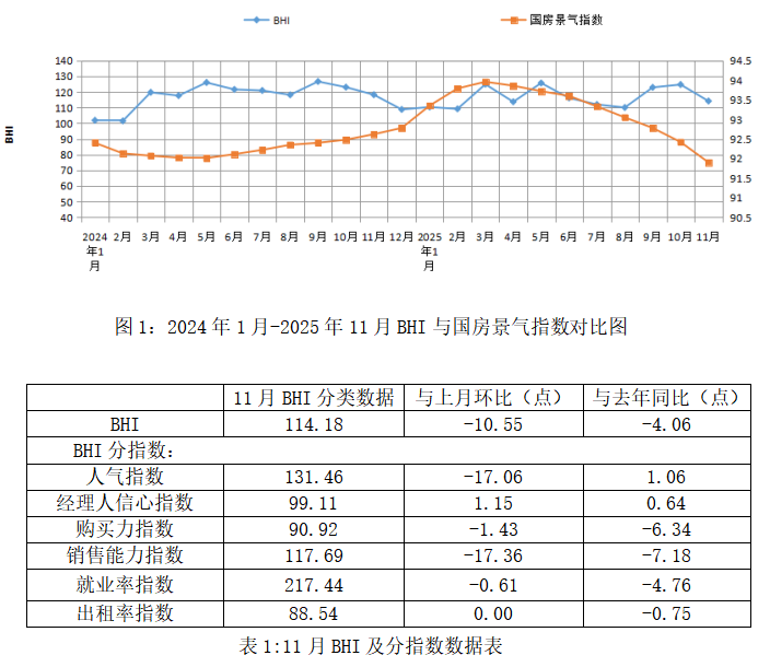 全國建材家居景氣指數BHI 11月份為114.18,環比下跌10.55點,同比下跌4.06點。全國規模以上建材家居賣場11月銷售額為1296.31億元,環比下跌12.85%,同比下跌5.75%。2025年1-11月累計銷售額為13231.85億元,同比下跌3.24%。11月BHI高位回落,全國建材家居市場開啟傳統冬日淡季行情。