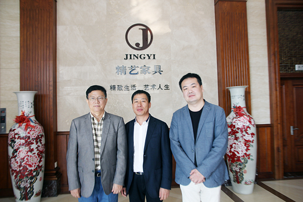領導合影左起浙江省家具協會理事長蔣鴻源、精藝家具董事長王天興、浙江省家具行業協會秘書長馬志翔