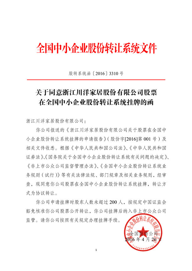 2016年4月26日,川洋家居在“新三板”即全國(guó)中小企業(yè)股份轉(zhuǎn)讓系統(tǒng)正式掛牌!股票代碼:837386。