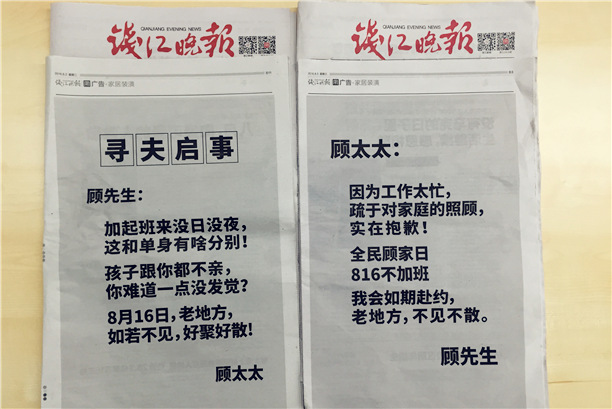 8月2日、3日, 在全國各地具有影響力的報紙,頭版紛紛被“顧氏夫婦”包下。先是顧太太刊登整版“尋夫啟事”大肆尋夫,字里行間痛斥丈夫長期加班,對家庭嚴重缺乏陪伴。微博大V第一時間轉發后,社交媒體頓時炸開了鍋,話題閱讀量瞬間破百萬,引起網友 熱議。
