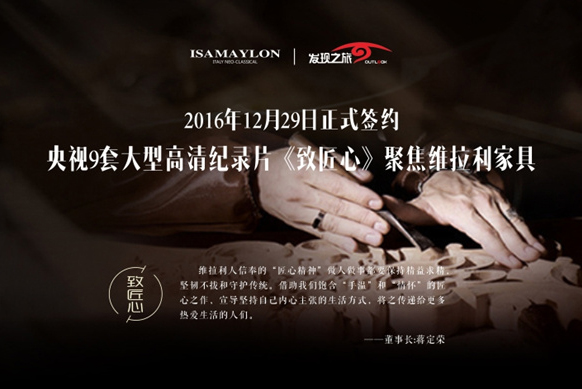 2016年12月29日央視大型高清紀錄片《致匠心》欄目攝制組一行來到浙江維拉利家具“伊莎美倫”生產(chǎn)基地,欄目總制片人張樂恒代表攝制組與公司董事長蔣定榮正式簽訂合作拍攝協(xié)議。用鏡頭語言講述工業(yè)流水線無法量產(chǎn)的手作情懷匠人氣質(zhì),通過紀錄片將工匠精神一站站傳承,讓世界愛上中國造。