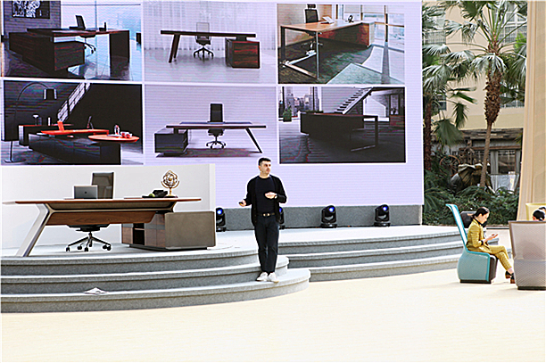 公司副總裁、國內營銷中心總經理施健致歡迎辭。公司副總裁、家具制造中心總經理陳園和,品牌管理中心總經理柴維龍,研發中心總經理張敘俊分別在國內會場會上介紹各自負責區域的工作情況。
