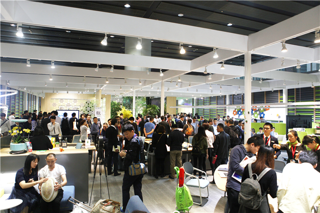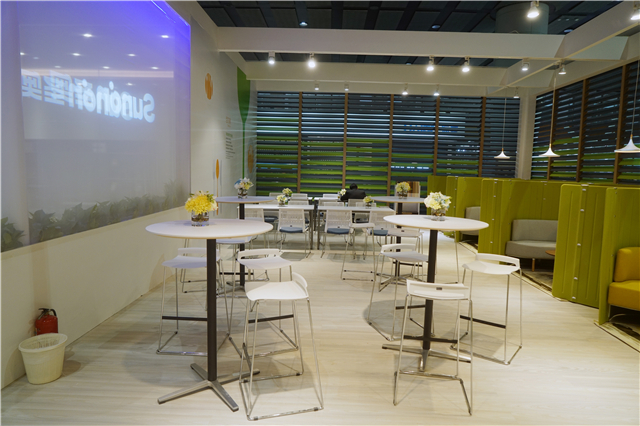 圣奧1000余平方米的展館,就像一個綠色花園,設計師在展館內融入了大型植物造景,辦公家具精品錯落有致地擺放其中,賞心而悅目。向客戶傳達綠色、健康、智能、高效的新型辦公理念的同時,也帶來一場視覺盛宴。