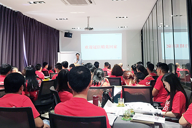 6月20日,冠臣精英培訓賽開班。為了讓學員們對辦公家具行業現狀有更好的了解,冠臣特邀浙江省家具行業協會名譽理事長蔣鴻源先生,浙江省家具行業協會執行副理事長兼秘書長馬志翔先生及杭州市家具商會副會長徐耀平先生出席了此次培訓。蔣理事長針對目前的家具行業現狀及發展趨勢進行深入剖析,在對冠臣現取得的成績給予高度評價后并對未來的發展方向進行了戰略指導。在對家具行業及冠臣發展方向深入了解后,學習課程就此拉開帷幕,學員們在熱烈的氛圍中開始了第一天的學習。為鞏固學習效果,晚上為學員安排了強化記憶訓練,各學員在組長的帶領下進行交流與實戰演練,不僅加深了學員對產品的理解,更有利于銷售精英之間的經驗分享。