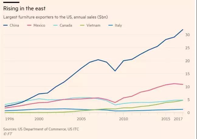 據美國國際貿易委員會(USITC)的數據顯示,美國進口家具主要來自中國,去年美國家具進口總額達630億美元,其中中國占50.9%。中國對美國的家具出口額從1996年的24億美元躍升至去年的319億美元,同期美國家具進口總額也才增長5倍。繼中國之后,墨西哥和加拿大也是對美國的家具出口大國,2017年出口額分別為108億美元和48億美元。