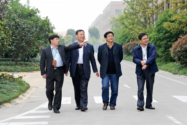 2014年4月24日,中國家具協會副理事長劉金良(左2)在浙江省家具行業協會理事長蔣鴻源(右2)的陪同下,到公司海寧生產基地調研。集團公司董事長倪良正(左1)、副總裁孟勇(右1)接待調研。