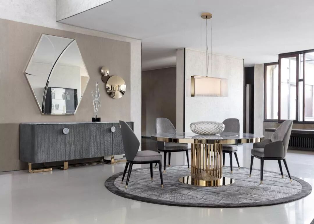 兩種風尚唯一的共同點就是對金色的青睞。從古舊的黃銅色到閃亮的淡黃色,從手工制作的金色葉片到外殼涂裝,這種貴金屬的顏色無所不在。甚至在戶外作品(見 Daniel Germani 為Gandia Blasco 公司設計的 Solanas 系列)中,金色也突然變成了基礎色。