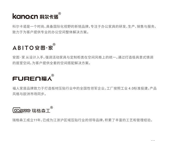 科爾卡諾集團有限公司是一家中外合資企業,國家高新技術企業,致力于家具制造和板材壓貼,是連捷集團的成員企業。目前集團旗下有三大業務板塊和四大品牌,分別是系統辦公家具品牌科爾卡諾和板材壓貼品牌福人家居、瑞格森工以及民用家具品牌安圖·家。
