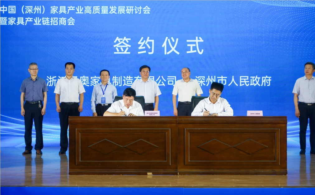 9月11日,在中國(guó)(深州)家具產(chǎn)業(yè)高質(zhì)量發(fā)展研討會(huì)及家具產(chǎn)業(yè)鏈招商會(huì)上,浙江省家具行業(yè)協(xié)會(huì)理事長(zhǎng)、圣奧集團(tuán)董事長(zhǎng)倪良正宣布了一則重大消息:圣奧北方總部項(xiàng)目落戶深州家具產(chǎn)業(yè)園,該項(xiàng)目將建成行業(yè)標(biāo)桿、北方樣板,助力圣奧實(shí)現(xiàn)新的五年規(guī)劃。現(xiàn)場(chǎng),深州市人民政府與圣奧正式簽約。