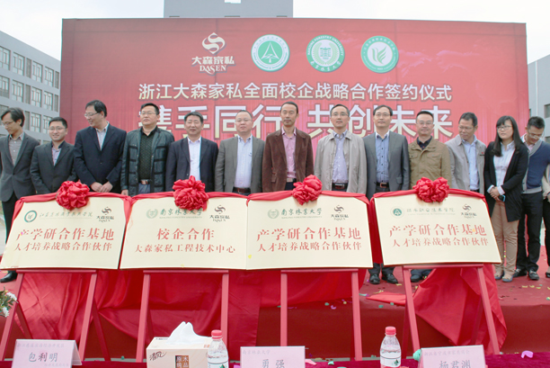 2014年11月8日上午,浙江大森家私有限公司與南京林業大學、麗水職業技術學院、江蘇農林職業技術學院三所高校的全面校企戰略合作揭牌儀式在寧波慈東工業區大森家私生產基地隆重舉行。浙江慈溪濱海經濟開發區包利明局長、經濟發展局黃斐科長,寧波市家具商務楊君淵秘書長、鄭淘之副秘書長,南京林業大學科技處勇強處長、材料學院周捍東書記、梅長彤院長,朱南峰副院長、孟國忠副院長,麗水職業學院環境工程分院湯書福院長、家具專業負責人盧海鋒老師,江蘇農林職業技術學院風景園林分院陳慧敏主任、衛佩行博士、張悅老師、郭葉瑩子老師等代表專程蒞臨浙江大森家私有限公司參加揭牌儀式,浙江大森家私有限公司董事長鄭善忠及公司各部門相關負責人出席會議并為合作基地成立揭牌。